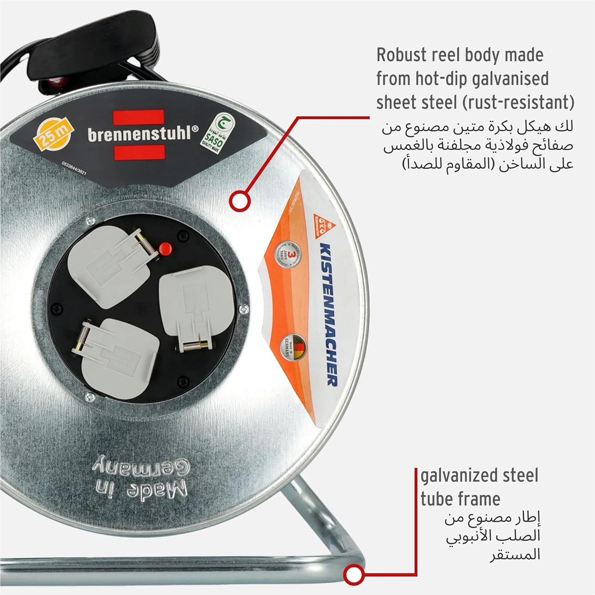 درم ستيل مجلفن مقاوم للصدأ والتلف وبه مقبض مريح يسهل سحب السلك ولفه بسرعة